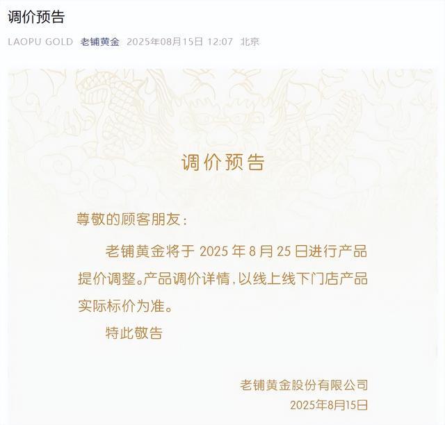 8月15日,老铺黄金宣布将进行产品提价调整,但具体涨幅一直未公布。据悉,2024年3月、2024年9月以及2025年2月老铺黄金