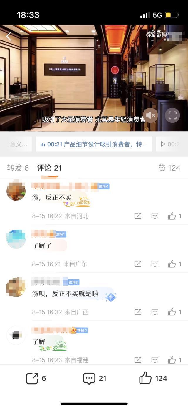 自然,也有被涨价吓退的消费者。有网友称,此次老铺黄金涨幅太大,本来还想去买呢,现在没有心情了。