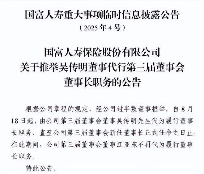 近日,国富人寿保险股份有限公司(下称“国富人寿”)发布公告称,根据公司章程的规定,经过半数董事推举,自8月18日起,由第三届董事会董事吴传明代为履行董事长职务,直至第三届董事会新任董事长正式任命之日止,在此期间,第三届董事会董事江亚东不再代为履行董事长职务。